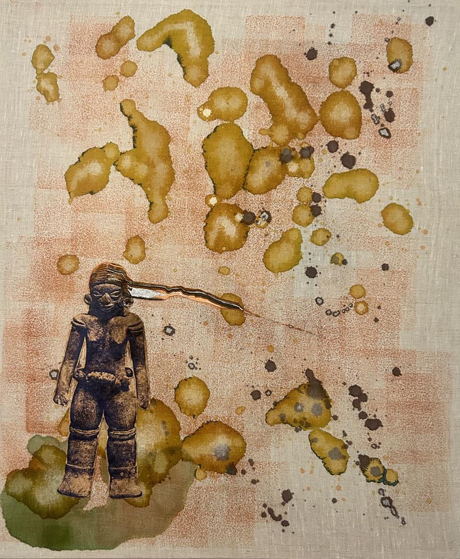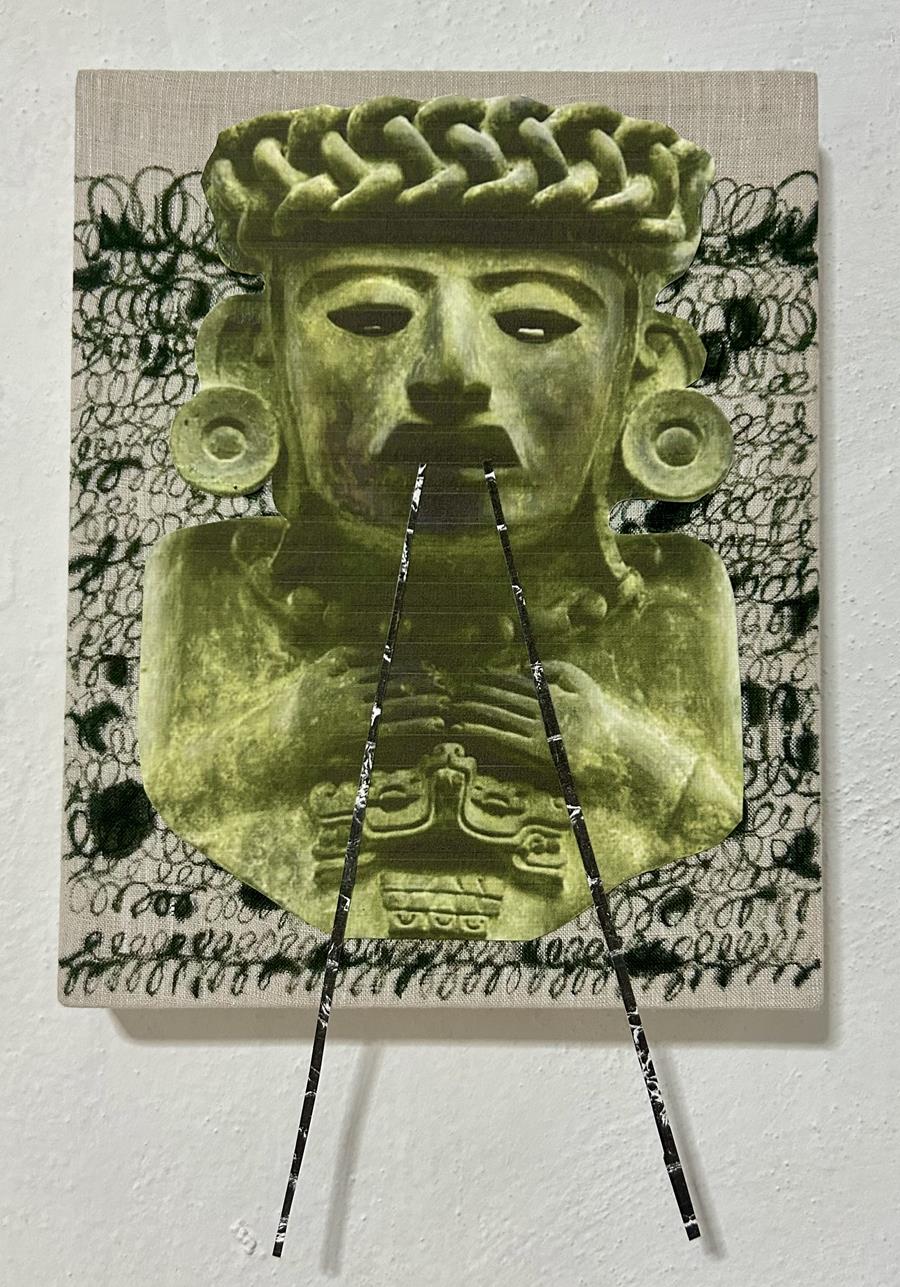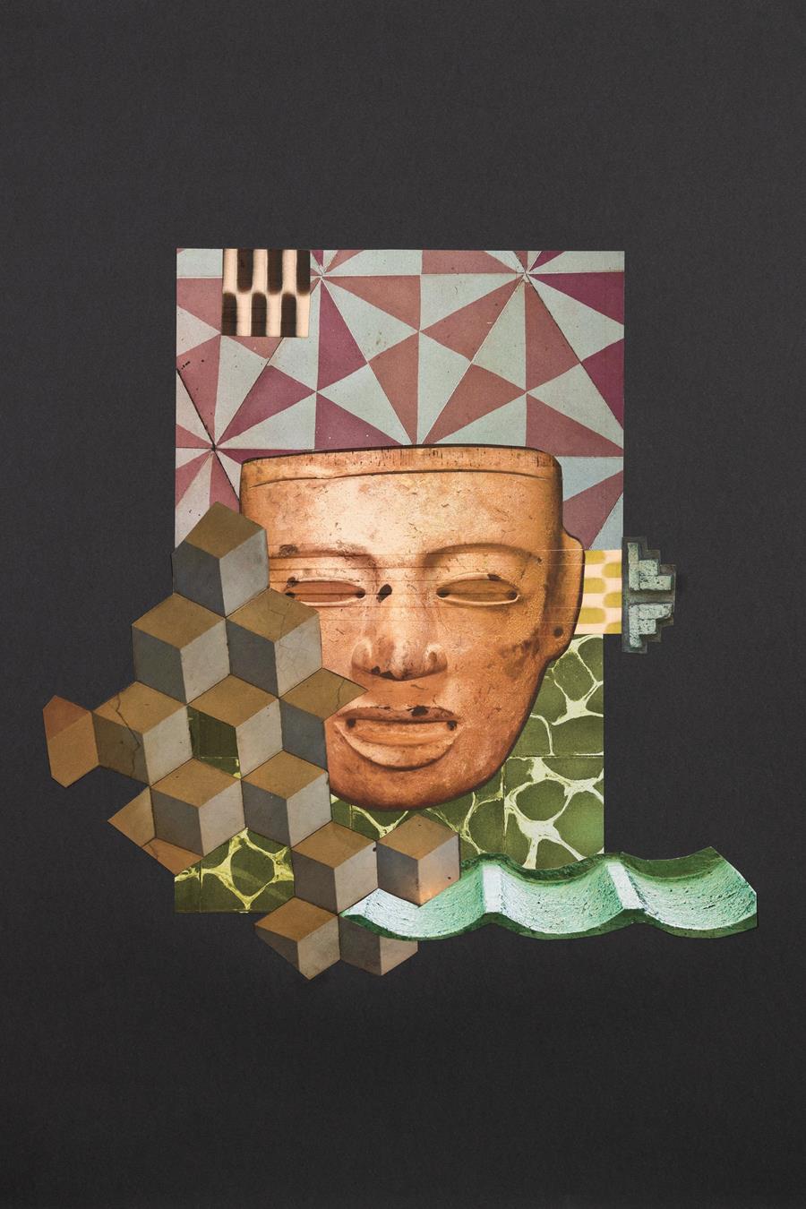 Sara Cardona was born in Mexico City where she currently lives and works. Using the analog process of cut-and-paste to create collages in the tradition of early twentieth century assemblage, the pieces are created in the spirit of editing film. These collages often become the foundation for large-scale sculptures in paper, metal, and quotidian objects. The works embrace Arte Povera techniques and seek to invite enigmatic pre-Columbian forms into the daily context of household objects and materials. Having grown up in a family involved in film and theater, the work is informed by an intersection of artifice, spectacle, photography and scenic construction.