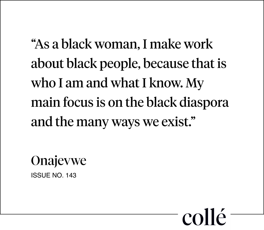 As a black woman, I make work about black people, because that is who I am and what I know. I think my main focus is on the black diaspora and the many ways we exist. I am Nigerian, but I am also British and American. I have now lived and existed in what would have been the transatlantic slave trade triangle. I think the ‘politicizing’ of my work is really a mirror for where we are as a society. I like to think that the themes I explore are pivotal in redressing the canon, and most of all, I am deeply happy and excited to be one of the many voices redressing the canon.